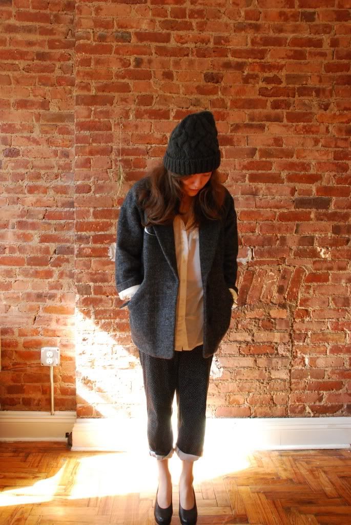 coat: isabel marant, shirt: h&m, poka dot pants: thrifted, shoes: a détacher